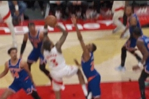 GIF-英格拉姆后仰跳投踢到布里奇斯腹部被吹进攻犯规
