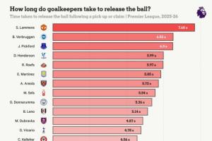 英超各队门将平均拿球后抱球时间: