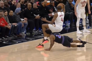 哈登击地传球差点失误 小莫布里拿到球被塞克斯顿扑抢滑铲犯规