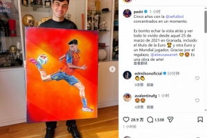 体育资讯3月26日讯 西班牙中场佩德里更新社媒动态,晒出与一幅以他为主题的画作。