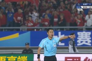 第24分钟,南通队球员程鑫拼抢时踩到巴特脚面,马宁向其出示黄牌警告。↓