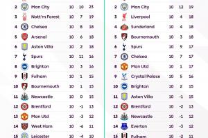 体育资讯11月06日讯 英超官方社媒更新动态,官方晒出了24/25赛季和本赛季联赛在10轮过后的积分榜情况,并配文:你注意到了什么?