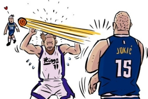 体育资讯11月6日讯 在之前掘金对阵国王的比赛中,约基奇贴着多曼塔斯·萨博尼斯头皮传球的一幕,被漫画家Jay Kim创作出一幅搞笑漫画。