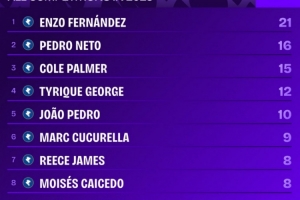 2025年切尔西参与进球排名(所有赛事):