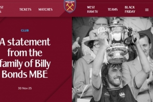 西汉姆联官方:俱乐部传奇、队史出场王比利·邦兹去世,享年79岁