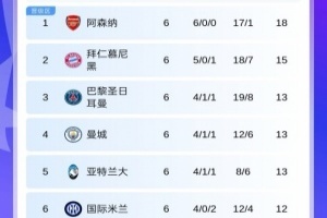 6轮过后,阿森纳6战全胜领跑,基本锁定前8席位,曼城升至第4,本菲卡两连胜靠近附加赛区,重燃晋级希望。