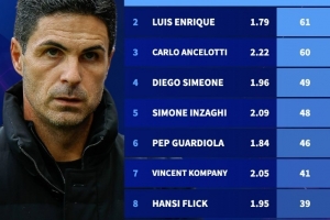 自阿尔特塔欧冠首秀主帅积分榜:阿尔特塔居首,恩里克次席