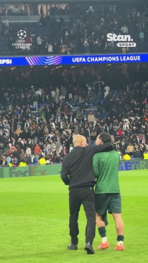比赛结束后,瓜帅多次与谢尔基拥抱互相致意,谢尔基听了瓜帅一席话后露出大笑,两人赢球后心情看起来都非常不错。