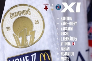 巴黎首发:39-萨福诺夫、33-扎伊尔·埃梅里、6-扎巴尔尼、51-帕乔、21-卢卡斯·埃尔南德斯、17-维蒂尼亚、8-法比安·鲁伊斯、47-恩贾恩图、49-姆巴耶、9-贡萨洛·拉莫斯、19-李刚仁
