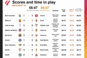 体育资讯12月16日讯 Opta统计了西甲第16轮的净比赛时间,并列出榜单,巴萨vs奥萨苏纳55分33秒排名第5位,阿拉维斯vs皇马55分18秒排在第6位。
