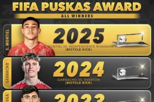 体育资讯12月16日讯 2025年普斯卡什奖公布,25岁的阿根廷球员圣地亚哥·蒙铁尔凭借一记禁区外的精彩倒勾获奖。算上这粒进球,普斯卡什已经连续4年由倒勾进球当选。