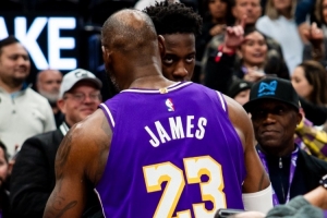 GIF-詹姆斯昨天赛后第一时间和场边观战的25年状元大热AJ·迪班萨拥抱耳语