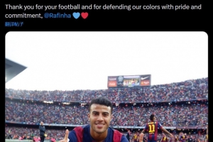巴萨官方写道:“感谢你带来的足球,以及感谢你以骄傲和责任心捍卫我们的颜色,拉菲尼亚💙❤️”