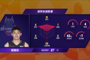 谢智杰本场首发登场,开局阶段山东高速迟迟未能打开得分账户,前3分钟只得2分,这时谢智杰开启进攻模式,他先接队友助攻三分远投命中,随后自己借助挡拆罚球线跳投得手,帮助球队迅速追近比分。进攻端,这位二年级新秀展现出了自己进攻的多样手段,除了挡拆后的处理球,谢智杰在转换进攻方面同样让人印象深刻,他多次快下得分或助攻队友。全场比赛,谢智杰个人生涯第3高的15分,7篮板和6次助攻同为生涯第2高。